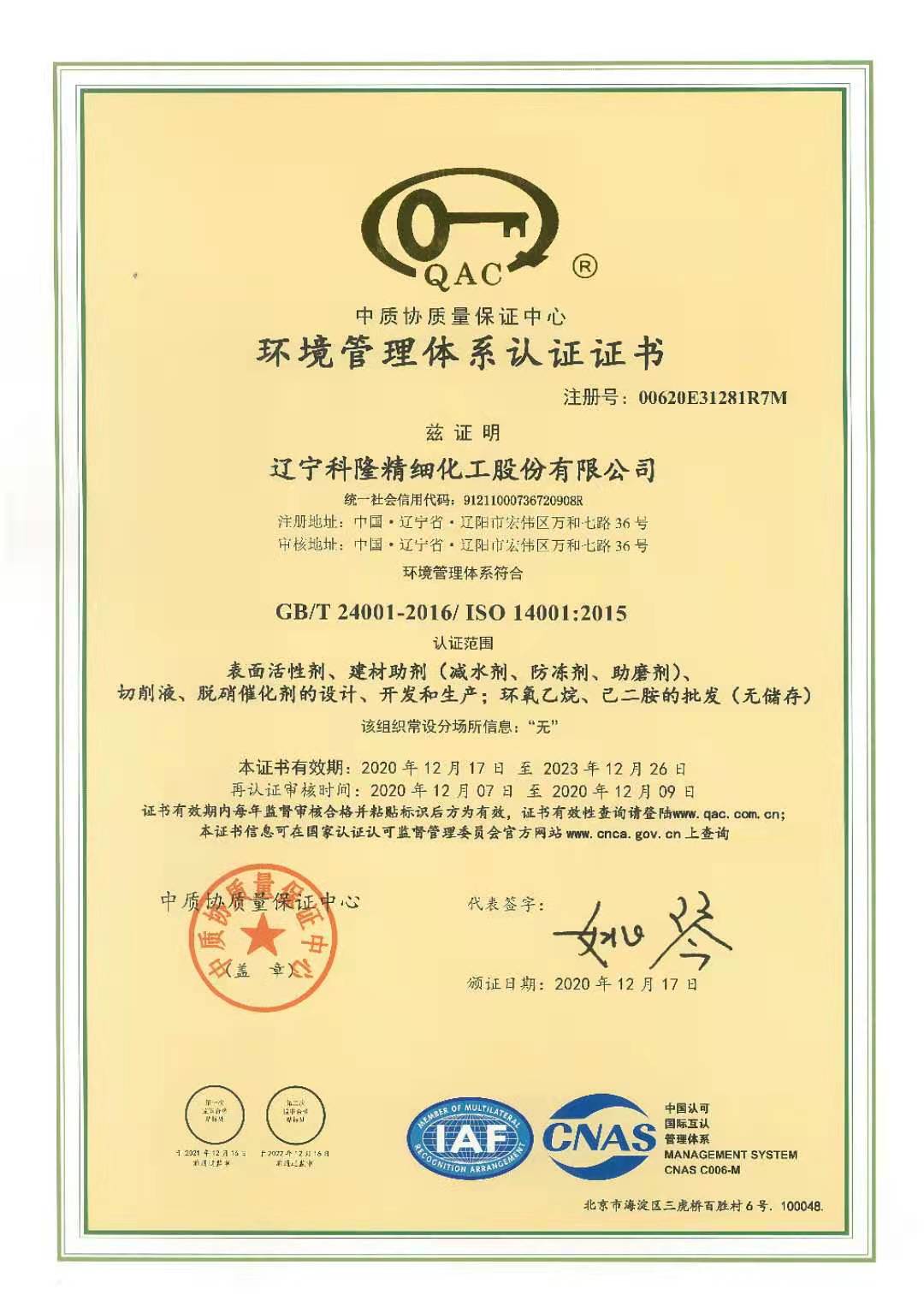 環境管理體系認證證書